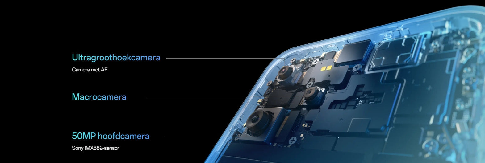 Groothoek: 50MP; f/1.8; FOV 79°; 5P-lens; AF; 2-axis OIS